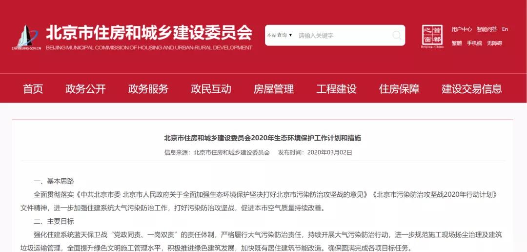 2020年3月2日,北京市住房和城鄉(xiāng)建設(shè)委員會發(fā)布《2020年生態(tài)環(huán)境保護工作計劃和措施》的通知,內(nèi)容強調(diào):