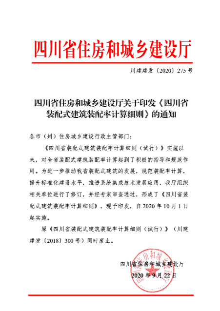 原《四川省裝配式建筑裝配率計算細(xì)則(試行)》(川建建發(fā)〔 2018〕 300 號)同時廢止。