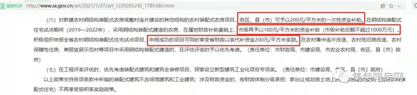 (六)對新建農(nóng)村鋼結(jié)構(gòu)裝配式農(nóng)房或整村連片建設(shè)的其他結(jié)構(gòu)的農(nóng)村裝配式農(nóng)房項目,各區(qū)、縣(市)可予以200元/平方米的一次性資金補(bǔ)助。在鋼結(jié)構(gòu)裝配式住宅試點期間(2019—2022年),采用鋼結(jié)構(gòu)裝配式建造的農(nóng)房,在屬地財政補(bǔ)助基礎(chǔ)上,市級再予以100元/平方米的資金補(bǔ)助(市級補(bǔ)助總額不超過1000萬元)。積極組織申報全省農(nóng)村鋼結(jié)構(gòu)裝配式住宅試點項目,申報成功的項目可同時享受省財政以獎代補(bǔ)資金200元/平方米獎勵。在農(nóng)村集中連片改造、農(nóng)村危舊房改造、農(nóng)村保障性住房、美麗宜居示范村等項目中采用鋼結(jié)構(gòu)裝配式建造的,在評優(yōu)評獎時予以優(yōu)先考慮。(責(zé)任單位:市財政局、市建設(shè)局、市農(nóng)業(yè)農(nóng)村局,各區(qū)、縣〔市〕政府)