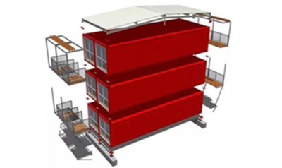 整個建筑是由密柱支撐框架結構體系與集裝箱式模塊相結合,若干個類似于集裝箱的模塊組合而成。首先在工廠預制集成,然后打包為集裝箱形式,采用標準車輛運送至施工現(xiàn)場,在現(xiàn)場以裝配化形式施工。