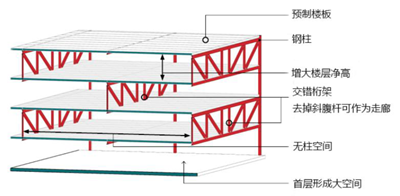 是指以預制鋼筋混凝土柱或鋼柱、鋼桁架、預制樓板等預制構件組成的大跨度空間結構,主體結構采用裝配式交錯桁架結構,配置外墻、內(nèi)隔墻和樓蓋系統(tǒng)的建筑。
